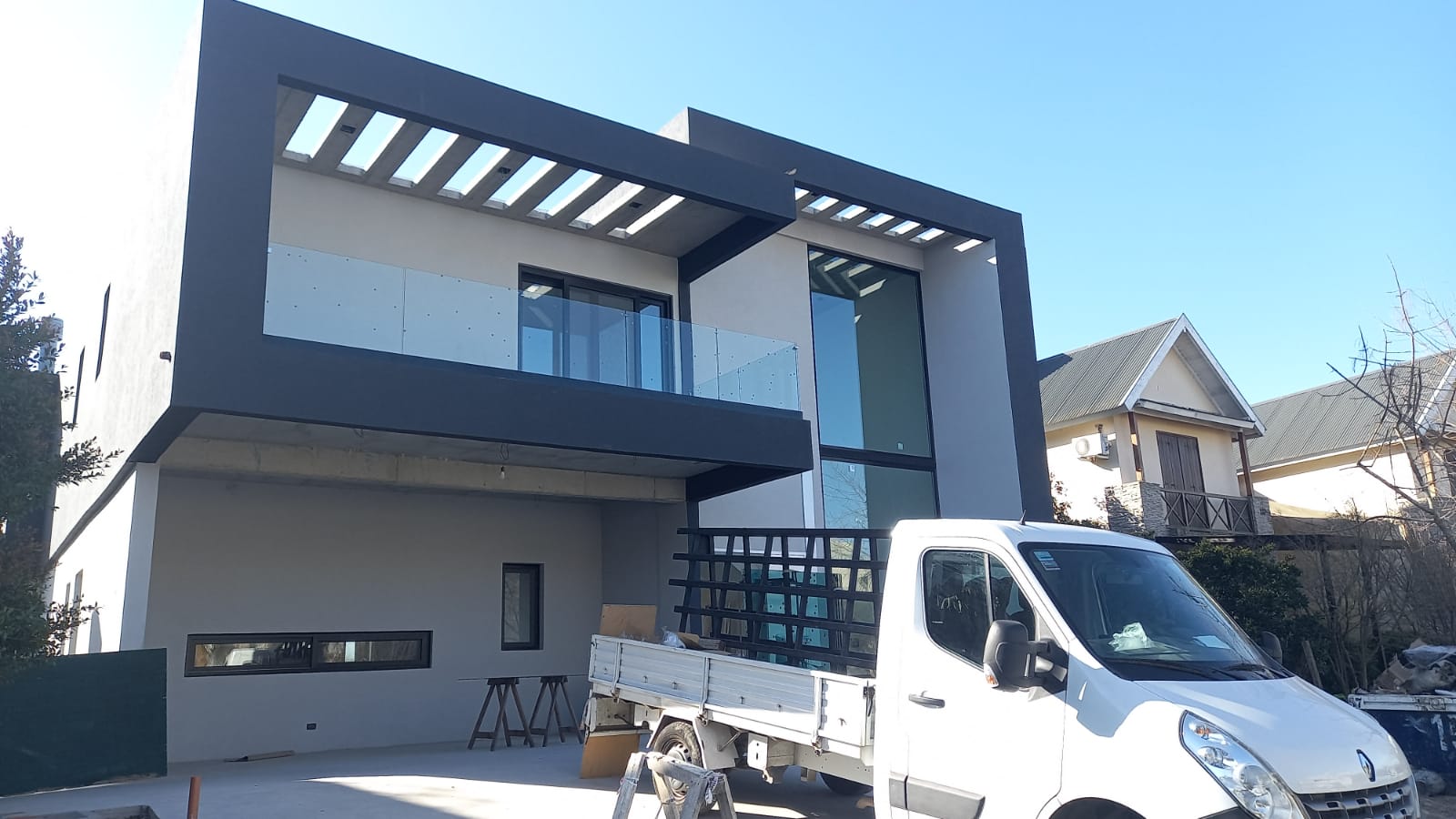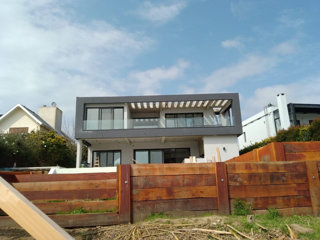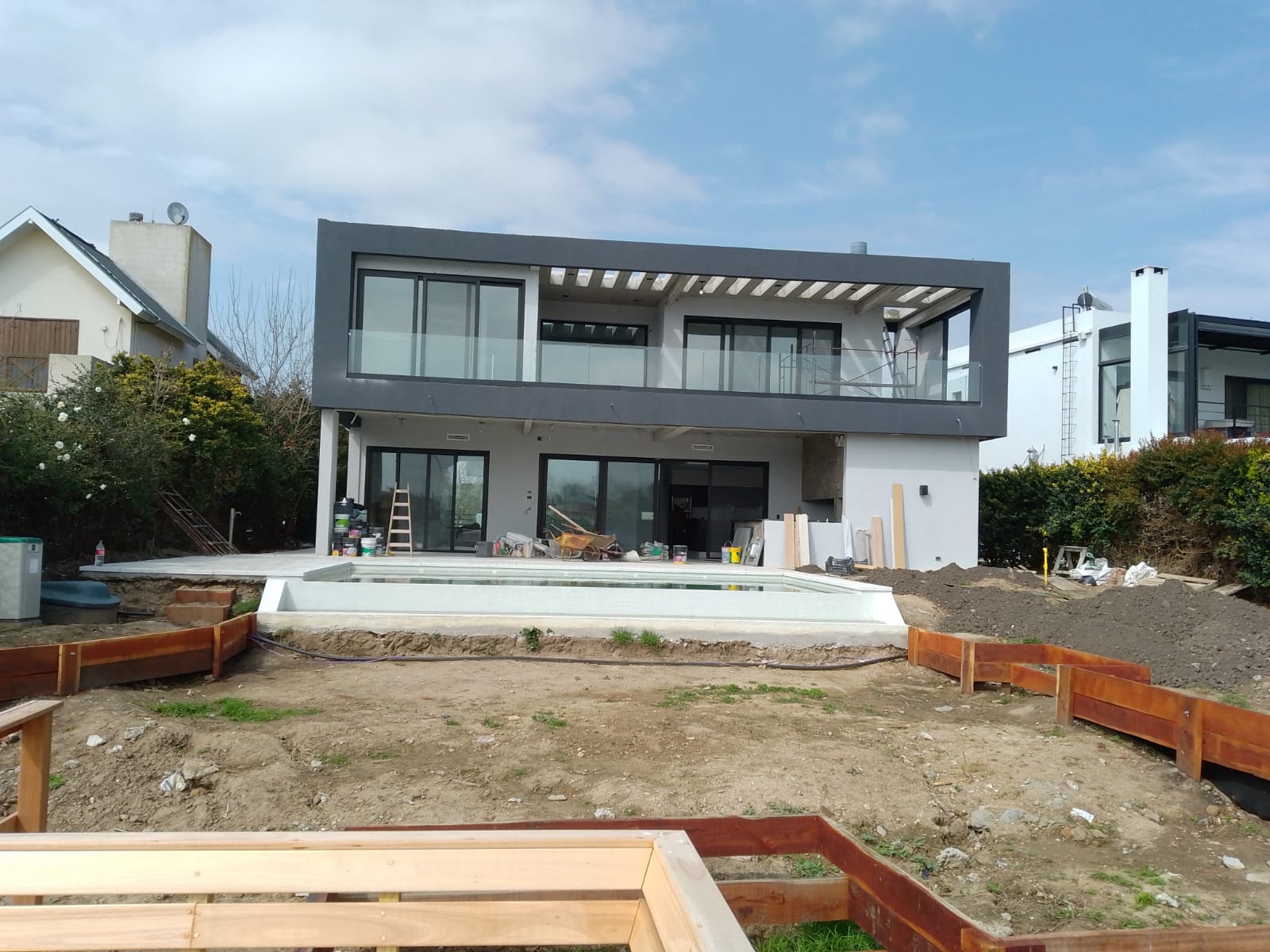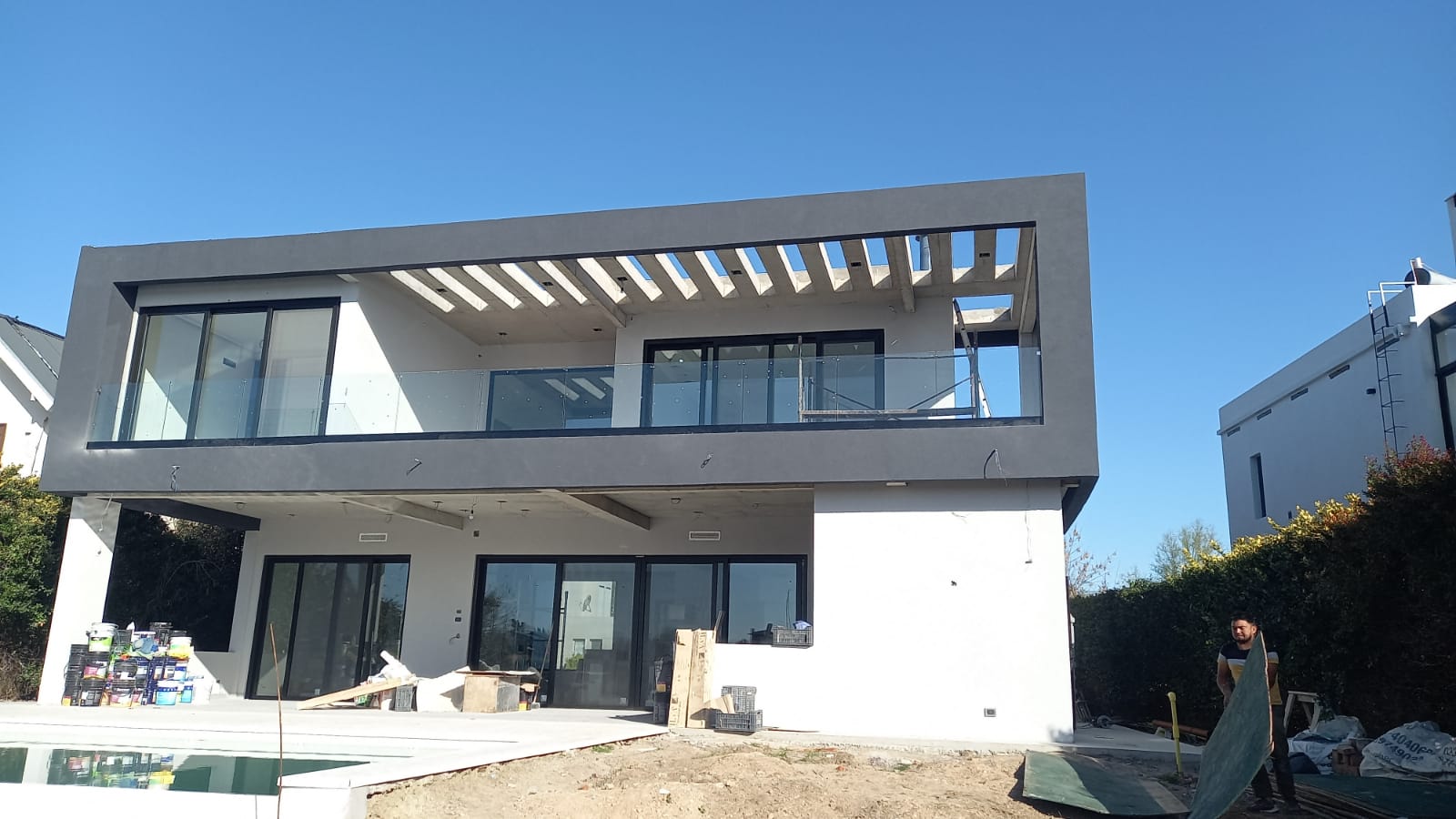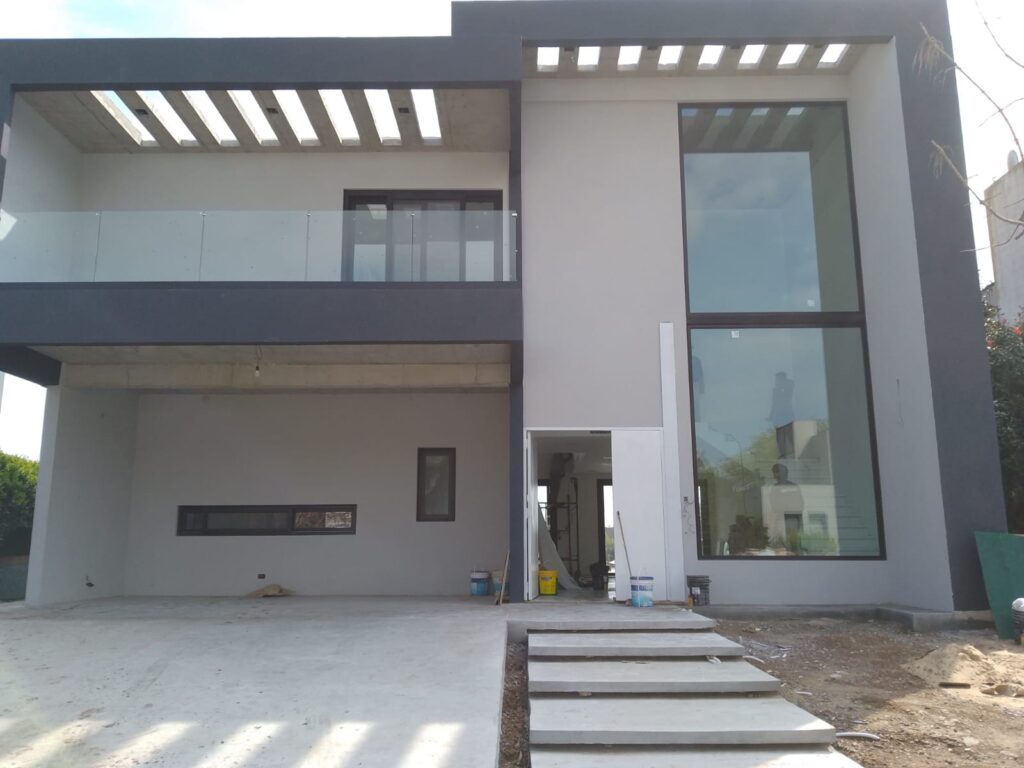 Esta moderna residencia en construcción se destaca por su diseño contemporáneo y líneas limpias, con una estructura de dos plantas y grandes ventanales que permiten abundante entrada de luz natural. La fachada combina tonos claros con detalles oscuros, creando un contraste elegante y una estética minimalista. Además, el amplio espacio exterior contempla una futura piscina, ideal para disfrutar del aire libre en un entorno de confort y sofisticación.